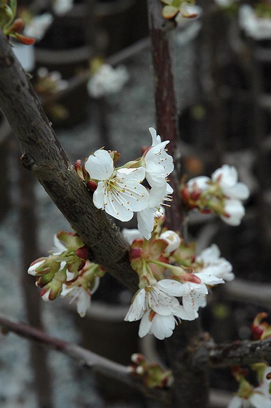Stella Cherry is clothed in stunning clusters of fragrant white flowers hanging below the branches in early spring before the leaves. It has dark green deciduous foliage. The pointy leaves turn yellow in fall. The fruits are showy dark red drupes carried in abundance in late summer. The fruit can be messy if allowed to drop on the lawn or walkways, and may require occasional clean-up. The smooth dark red bark adds an interesting dimension to the landscape.