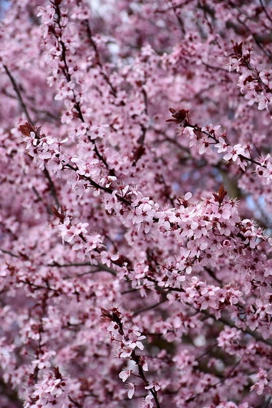 Mt. St. Helens Plum is blanketed in stunning clusters of fragrant pink flowers along the branches in mid spring before the leaves. It has attractive deep purple deciduous foliage. The pointy leaves are highly ornamental and turn an outstanding burgundy in the fall. The fruits are showy purple drupes displayed in mid summer.