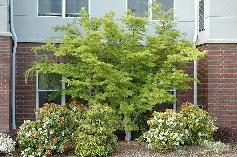 Seiryu Japanese Maple is primarily valued in the landscape for its ornamental upright and spreading habit of growth. It features subtle corymbs of red flowers rising above the foliage in mid spring before the leaves. It has attractive light green deciduous foliage which emerges red in spring. The deeply cut ferny palmate leaves are highly ornamental and turn outstanding shades of gold, orange and red in the fall. The rough gray bark and red branches add an interesting dimension to the landscape.
