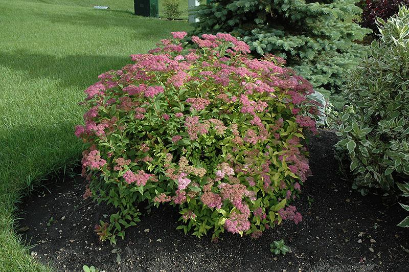 Goldflame Spirea features showy clusters of hot pink flowers at the ends of the branches from late spring to early summer. It has attractive yellow deciduous foliage which emerges tomato-orange in spring. The small serrated pointy leaves are highly ornamental and turn an outstanding scarlet in the fall.
