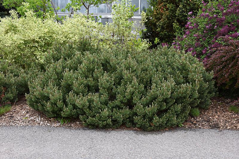 Slowmound Mugo Pine will grow to be about 3 feet tall at maturity, with a spread of 4 feet. It tends to fill out right to the ground and therefore doesn't necessarily require facer plants in front. It grows at a slow rate, and under ideal conditions can be expected to live for 50 years or more.