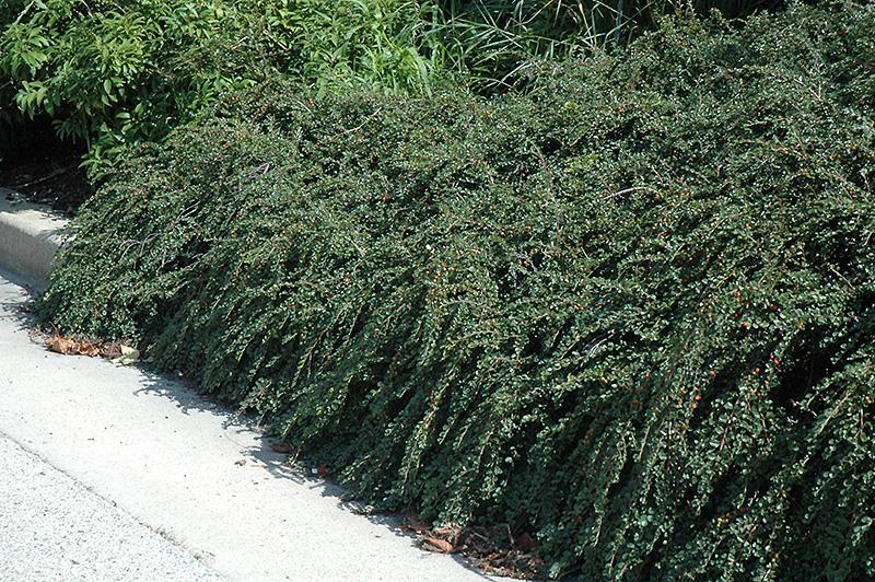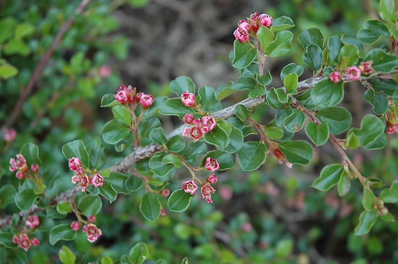 A very popular low growing groundcover, with a mounded spreading habit of growth; dense, tightly held branches; light pink flowers in spring along the branches, followed by striking red fruit in fall, one of the overall best groundcovers