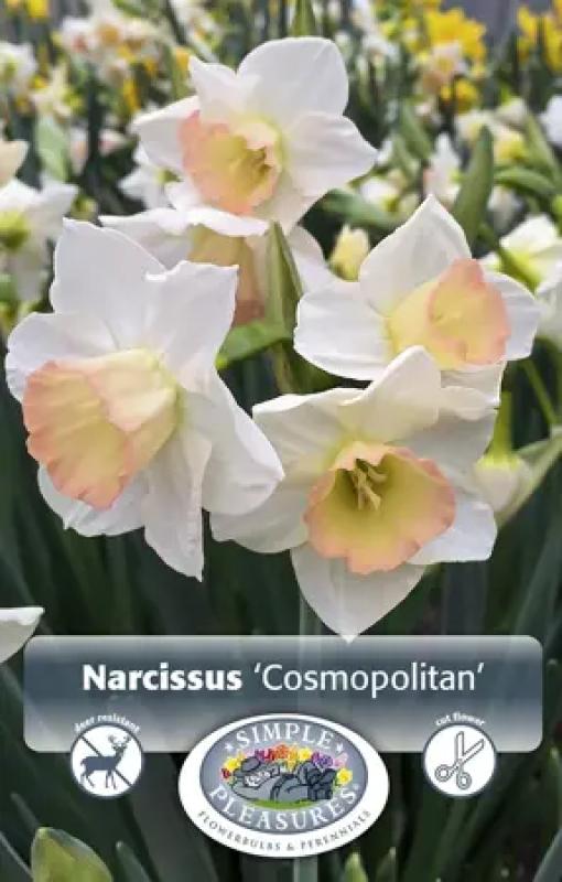 The Narcissus 'Cosmopolitan' is a delightful addition to any garden, showcasing stunning blooms that bring a touch of elegance and charm. This variety features vibrant, multi-colored petals that create a striking visual display in your landscape.