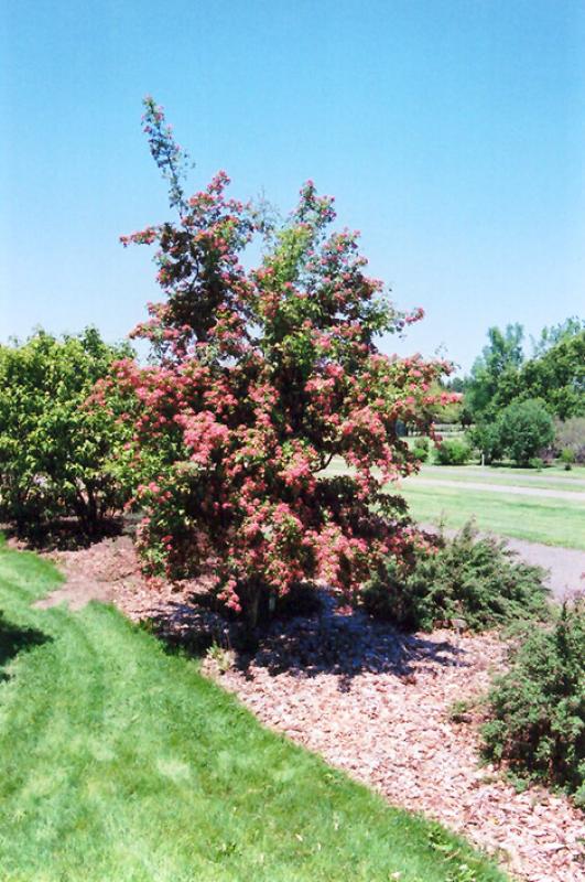 A wonderful disease-resistant improvement on the species, makes a beautiful small accent tree for home landscapes; covered in reddish pink flowers with white centers in spring and showy scarlet fruit in fall, very thorny