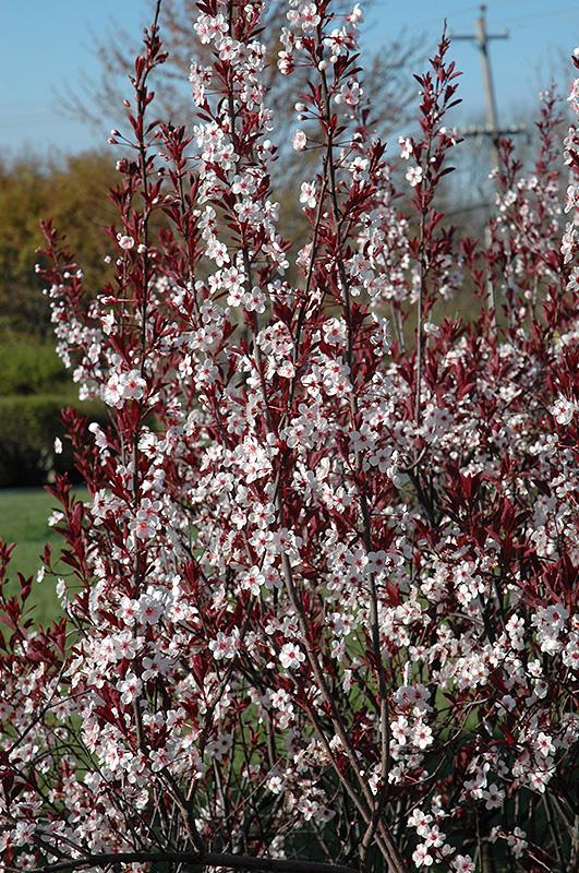 A sturdy, intermediate sized variety with an upright and spreading habit; stunning white-pink flowers in spring followed by dark purple foliage that stands out all season long; needs full sun and well-drained soil; adds lasting color to a garden
