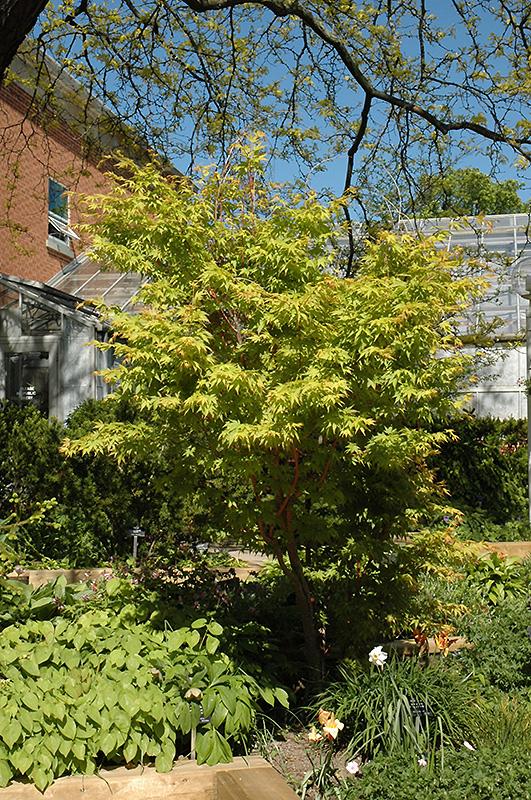 Coral Bark Japanese Maple is primarily valued in the landscape for its ornamental globe-shaped form. It features subtle corymbs of red flowers rising above the foliage in mid spring before the leaves. It has attractive lime green deciduous foliage which emerges coral-pink in spring. The palmate leaves are highly ornamental and turn outstanding shades of gold, orange and red in the fall. The rough gray bark and coral-pink branches are extremely showy and add significant winter interest.