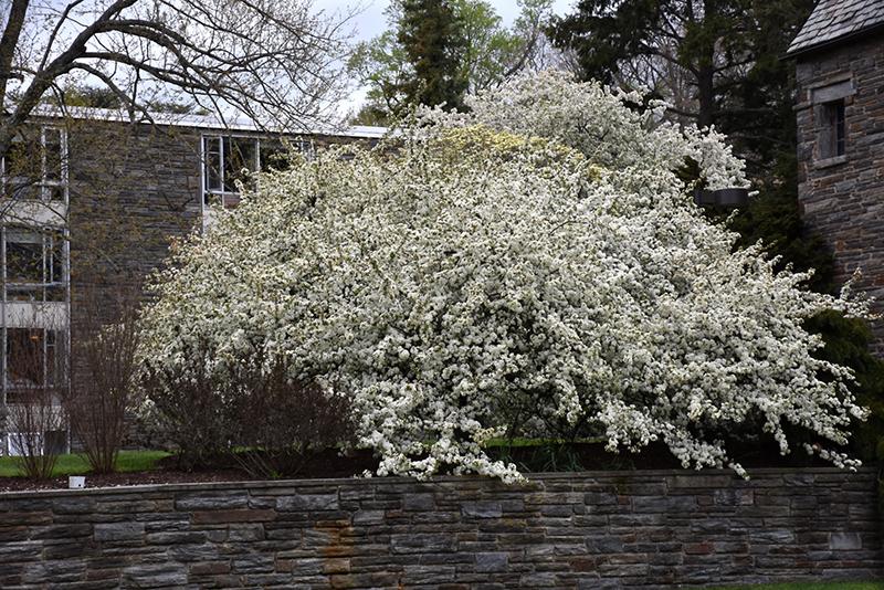 A distinctive ornamental shrub which features fragrant white flowers emerging from red buds in spring followed by red fruit in fall, distinctly horizontal branching habit is very attractive; needs well-drained soil and full sun, makes a great accent