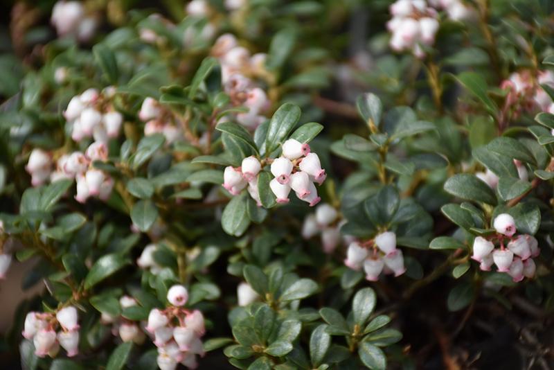 Massachusetts Bearberry features dainty nodding shell pink bell-shaped flowers at the ends of the branches in mid spring. It features an abundance of magnificent red berries from late summer to late fall. It has forest green evergreen foliage. The tiny glossy round leaves turn burgundy in the fall, which persists throughout the winter.