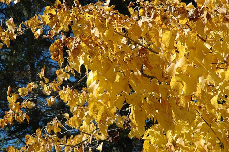 Redmond Linden is primarily valued in the landscape for its distinctively pyramidal habit of growth. It features subtle clusters of fragrant buttery yellow flowers with tan bracts hanging below the branches in early summer. It has dark green deciduous foliage. The large heart-shaped leaves turn an outstanding yellow in the fall.