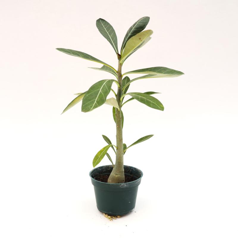 The Adenium, commonly known as the Desert Rose, is a captivating succulent that adds a touch of elegance to any collection. With its striking, thick trunk and vibrant green foliage, this plant is not only visually appealing but also a low-maintenance option for enthusiasts and beginners alike.