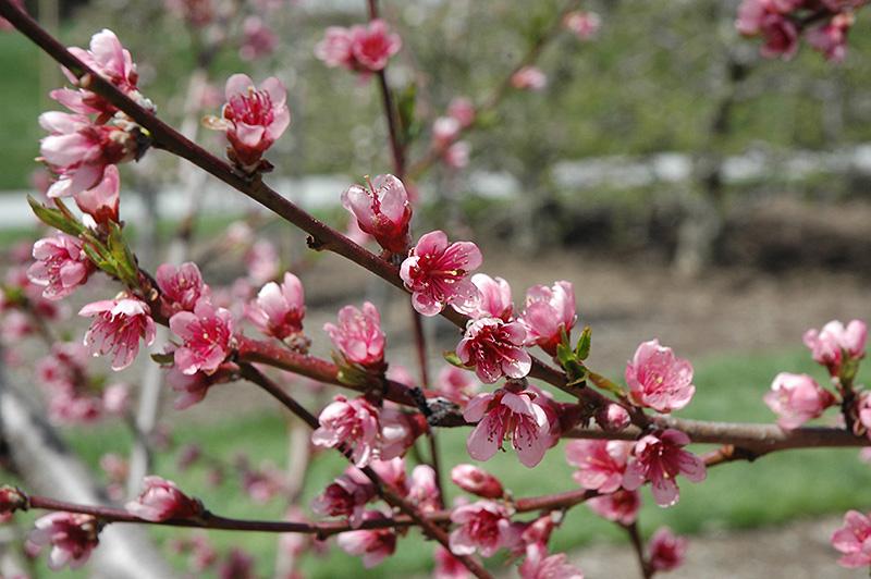 Reliance Peach is clothed in stunning clusters of fragrant pink flowers along the branches in early spring, which emerge from distinctive rose flower buds before the leaves. It has dark green deciduous foliage. The narrow leaves turn yellow in fall. The fruits are showy yellow drupes with a red blush, which are carried in abundance in mid summer. The fruit can be messy if allowed to drop on the lawn or walkways, and may require occasional clean-up.