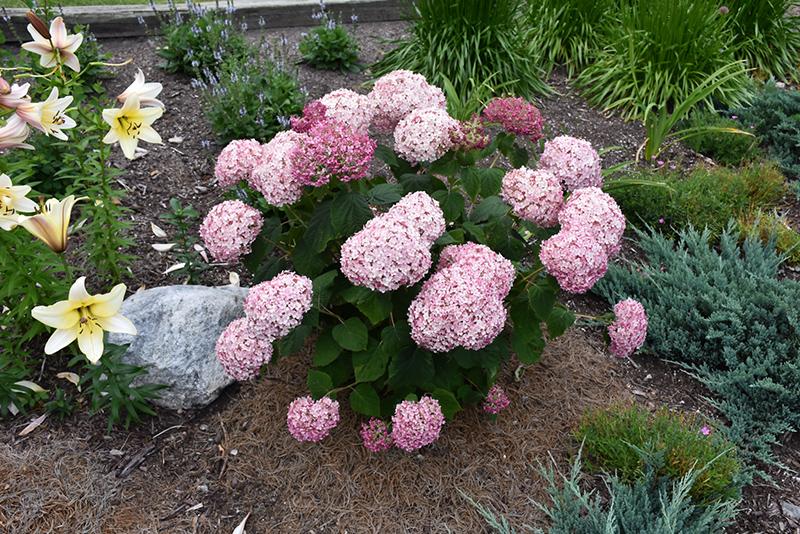 Incrediball® Blush Smooth Hydrangea features bold balls of pink flowers with silver overtones at the ends of the branches from mid to late summer. The flowers are excellent for cutting. It has dark green deciduous foliage. The heart-shaped leaves do not develop any appreciable fall color.
