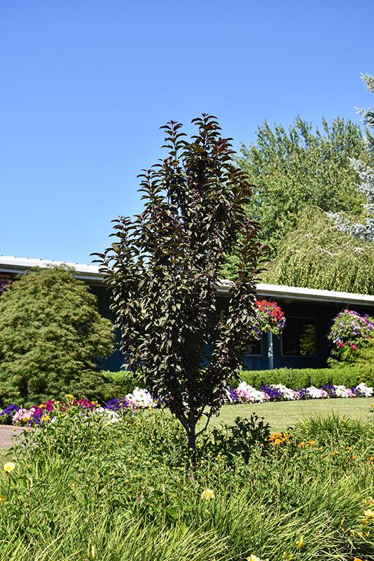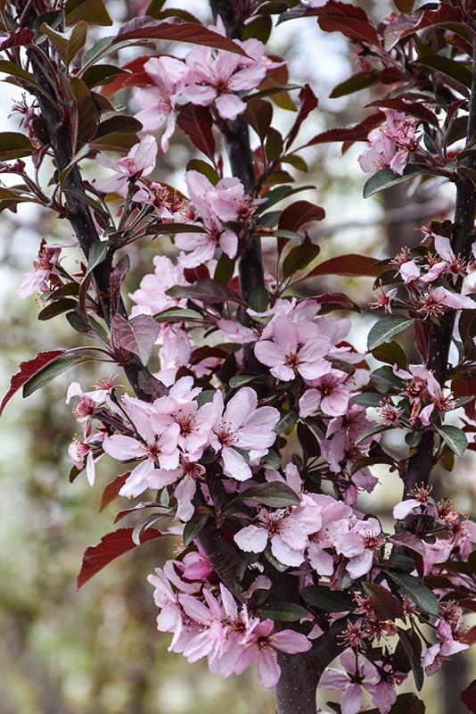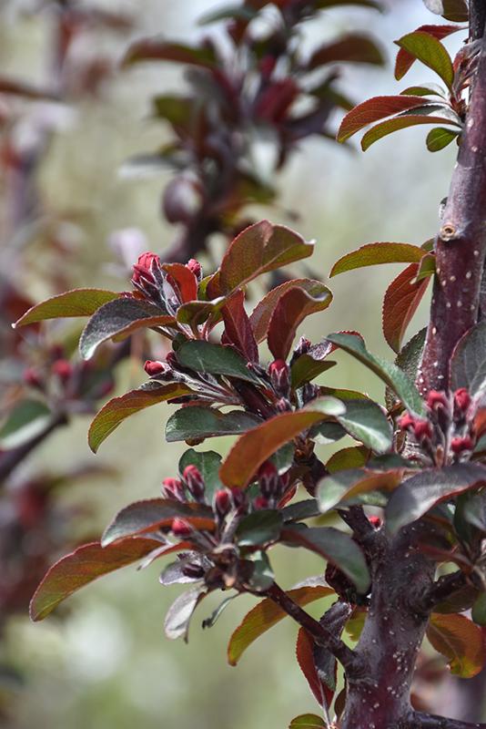 A stunning selection with a tightly columnar habit and excellent disease resistance; bright magenta flowers in spring; small, bright red fruit persists into fall and winter; foliage holds its dark purple color, with bronze-orange tints in fall