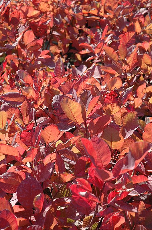 An excellent large garden shrub valued for its brilliant orange and red fall foliage, large flowers and pink inflorescences which produce a fuzzy, smoky appearance throughout summer, hence the name; a very large shrub, use accordingly